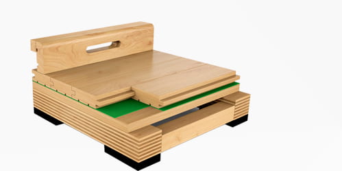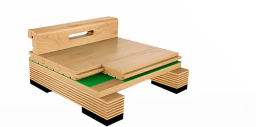 運(yùn)動(dòng)木地板場(chǎng)地的結(jié)構(gòu)由彈性墊層或彈性結(jié)構(gòu)層、彎曲剛性強(qiáng)的載荷分布層(龍骨或毛地板)、面層(面層地板)三層構(gòu)成。